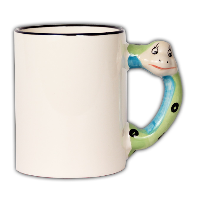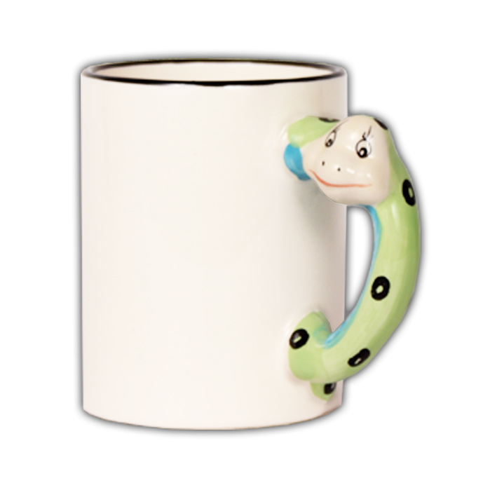 Kvalitný biely hrnček klasického tvaru s uškom v tvare hada. Bez potlače.