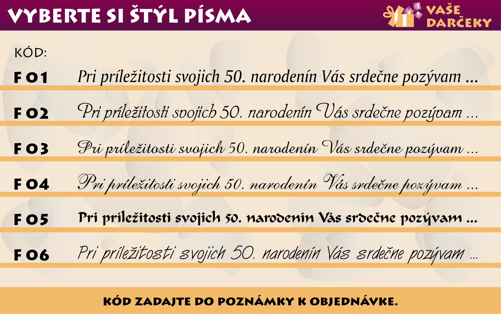 Môžete si vybrať štýl písma pre vaše oznámenie. Do poznámky k objednávke stačí zadať kód písma (viď. obrázok so štýlmi písma). Pokiaľ nezadáte žiadny kód, bude použitý defaultný štýl písma uvedený na obrázku.